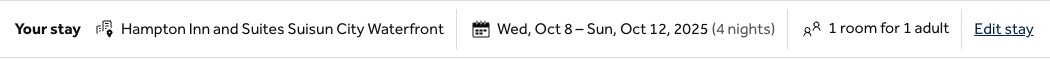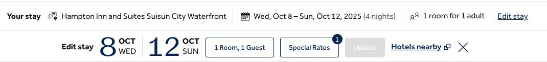 - Go to: Hampton Inn and Suites Suisun City Waterfront site you’ll see that the check-in (October 8th) and check-out (October 12th) dates are set and the code applied.